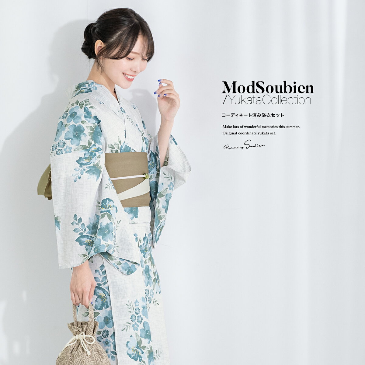 イーグルス感謝祭☆最大1000円クーポン配布中☆浴衣 セット レディース 浴衣セット 半幅帯 SOUBIENオリジナル 大人 3点セット 吸水速乾 ライトグレー系 灰色 ブルー グリーン 青 緑 花柄 ベージュ 送料無料