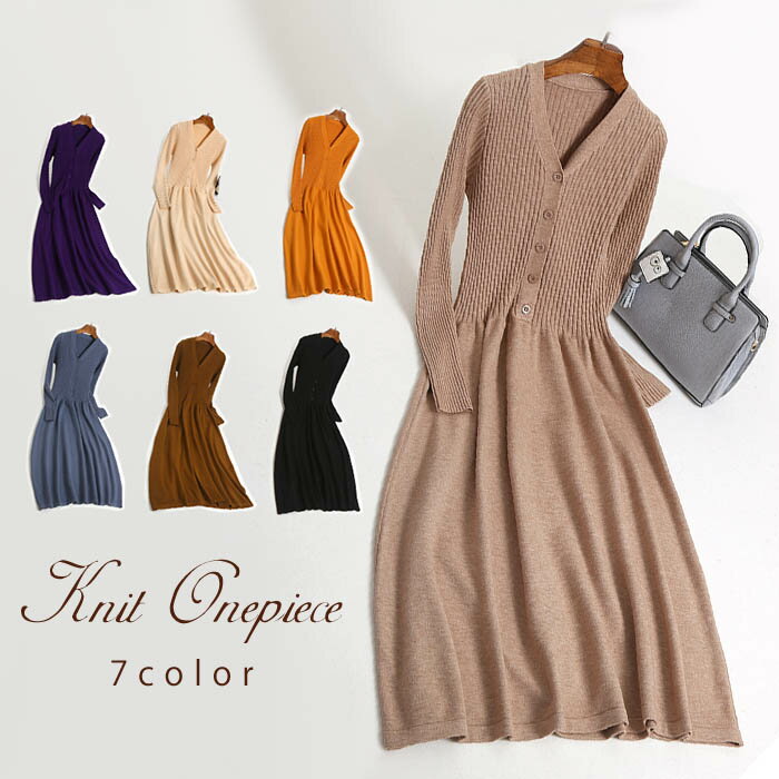 【新色追加!】ニットワンピース ワンピース ニット リブ リブニット秋冬 ニットワンピ 大人 春 長袖 きれいめ ロング Vネック フレア 上品 袖あり 大人 カジュアル 通勤 オフィス 送料無料