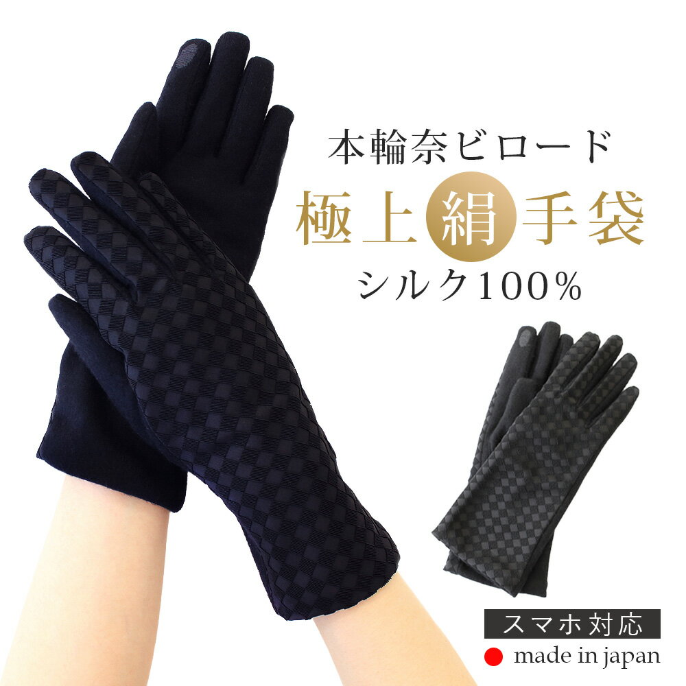 絹 手袋 日本製 輪奈ビロード 極上 レディース スマホ対応 着物 絹手袋 市松柄 ビロード 保温 温かい おしゃれ 手袋 レターパックプラス ニット生地 スマートフォン対応 ブラック エレガント 市松 シルク 防寒 温かい ギフト silk365 ギフト 冬 天鵞絨手袋 黒 和小物 伊と幸