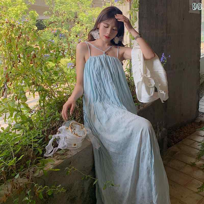 レディース カジュアル 夏 ワンピース ドレス ブルー 海辺 リゾート スカート サスペンダー 長期 休暇 小さい フレッシュ ビーチ 旅行