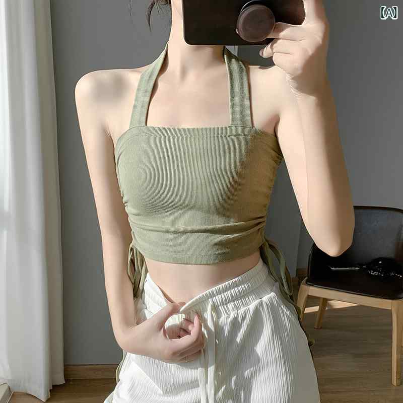 レディース 夏 ノースリーブ ランニング シャツ サマー フェス 音楽祭 リゾート ビーチ ホルターネック サイド 巾着 ベスト T 女性 ネジ チューブ トップ アウター サスペンダー スタイリッシュ ガール ショート トップス