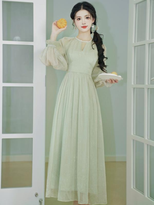 レディース フレンチ レトロ ハイウエスト グリーン ビーズ ドレス フェアリー 長袖 春秋 シフォン レディース ワンピース