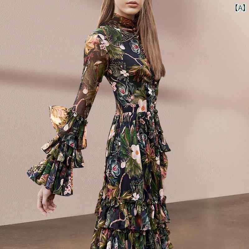 ドレス スカート レディース フレンチ レトロ フリル フェアリー 長袖 ヴィンテージ プリント ロング ケーキ