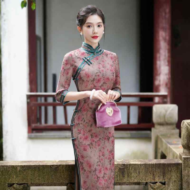 ・素材: ポリエステル繊維、95%以上・カテゴリ: チャイナドレス・着丈: ロング・襟の形: スタンドカラー・袖丈: 七分袖・スリット: ハイ・カラー: ピンクローズ・サイズ展開: M、L、XL、XXL、XXXL、4XL、5XL・スタイル: レトロ・対象: 大人・テイスト: 文芸、レトロ・性別: 女性・袖のタイプ: レギュラー
