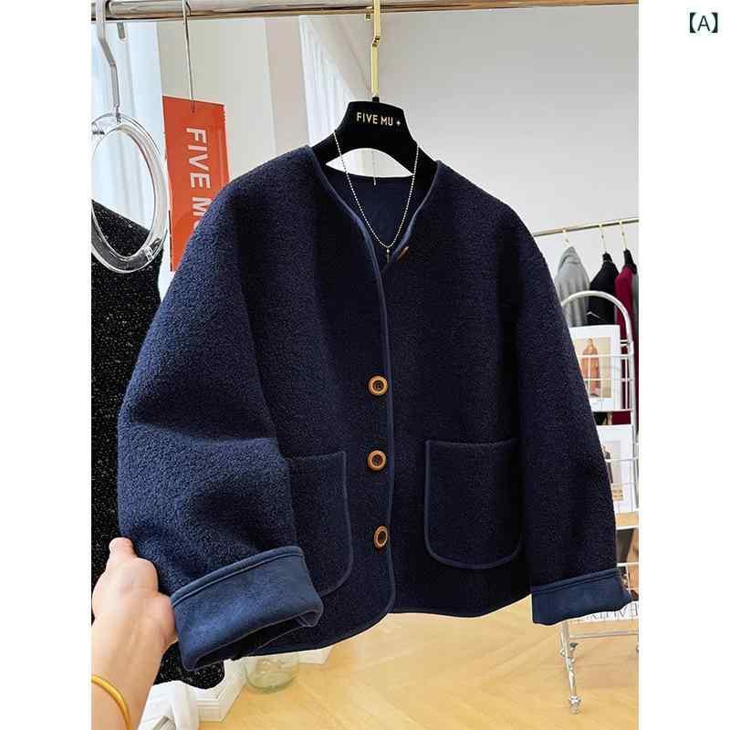ジャケット レディース 高級感 韓国風 ラムウール ラウンドネック ショート丈 アウター 秋冬 ゆったり カジュアル 紺色