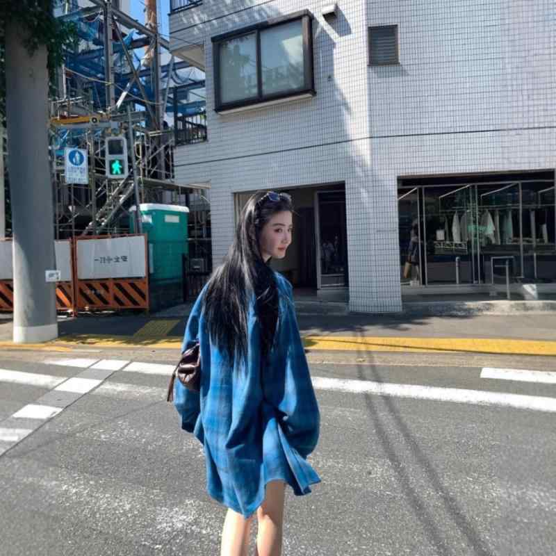 シャツ レディース チェック柄 長袖 ポリエステル アクリル ゆったり ミディアム丈 POLO襟 切り替え 春夏 カジュアル かわいい ブルー系