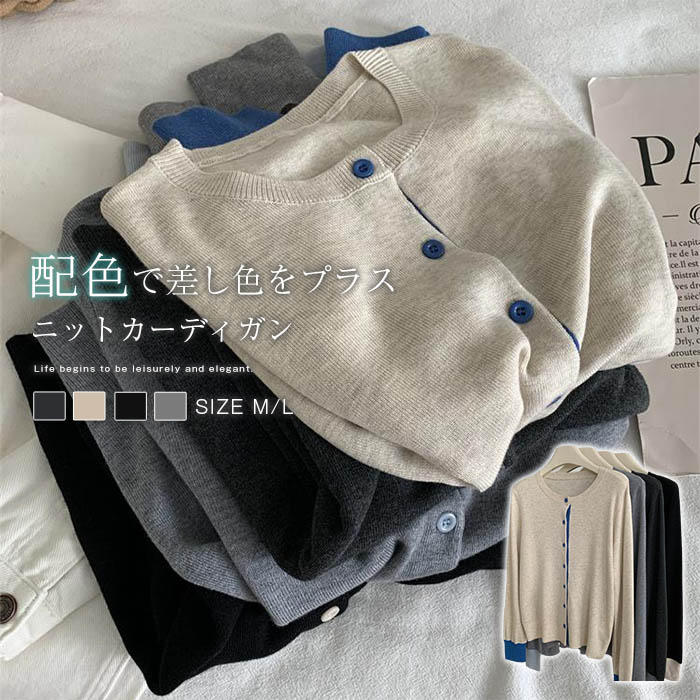配色 ニット カーディガン レディース 春 薄手 ニットトップス 長袖 クールネック ニットカーディガン ニットセーター 前開き ボタン 羽織り 重ね着 はおり 体型カバー ゆったり 大きいサイズ 大人 カジュアル シンプル オフィス フォーマル 春秋 もちもち 黒 送料無料
