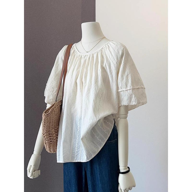 シャツ レディース 大きいサイズ フレンチ レース ゆったり かわいい 半袖 ブラウス トップス 米白色 婦人服 ラウンドネック 体型カバー おしゃれ
