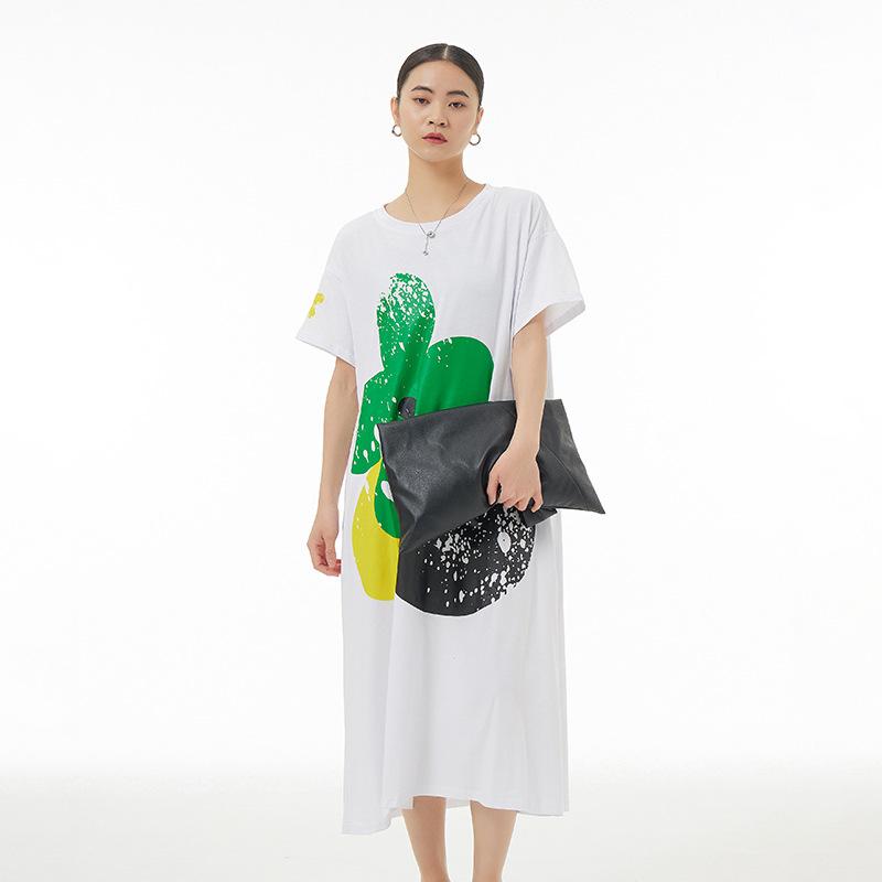 ・柄: 植物柄・流行要素: クラッシュ加工・加工: プリント・主な素材: 綿95%以上・カラー: ホワイト・サイズ: フリー・スタイル: 日韓カジュアル・スカートシルエット: Aライン・ネックライン: クルーネック・対象年齢: 大人・着丈: ミディ丈・袖タイプ: レギュラー袖・袖丈: 三分丈・性別: レディース