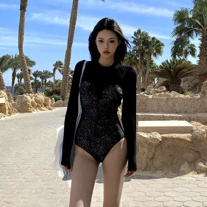 ・カテゴリ: ワンピース水着・性別: 女性・対象年齢: 成人・主な素材: ポリエステル、スパンデックス18%・裏地: ポリエステル、スパンデックス5%・重量: 約300g・柄: プリント・デザイン特徴: セクシー、タイト、バックレス、高伸縮性、耐久性、控えめ・パッド/ワイヤー: 胸パッド付き、ノンワイヤー・用途: スイミング、ウォータースポーツ・袖丈: 長袖・カラー展開: ブラック・サイズ展開: M、L、XL