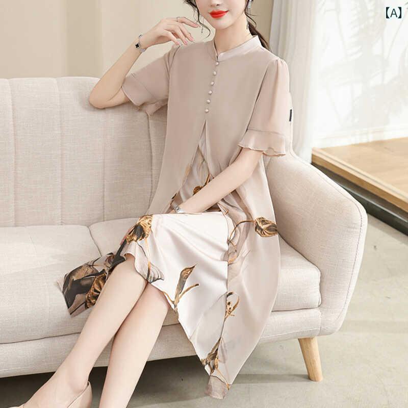 夏 服 高貴 チャイナ ドレス 半袖 チャイナ風 体型カバー ロング スカート