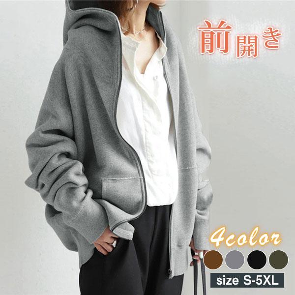 体型カバー ゆったり フード付き アウター 羽織り カジュアル 無地 長袖 ジップアップ 前開き トップス レディース パーカー