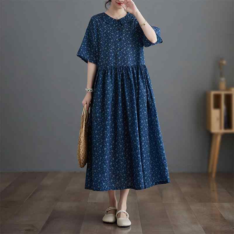 ワンピース 春夏 ラミー 麻 花柄プリント レトロ 上品 襟付き 半袖 ゆったり 体型カバー Aライン フレア ロング丈 マキシ丈 カジュアル 普段使い ランカラー