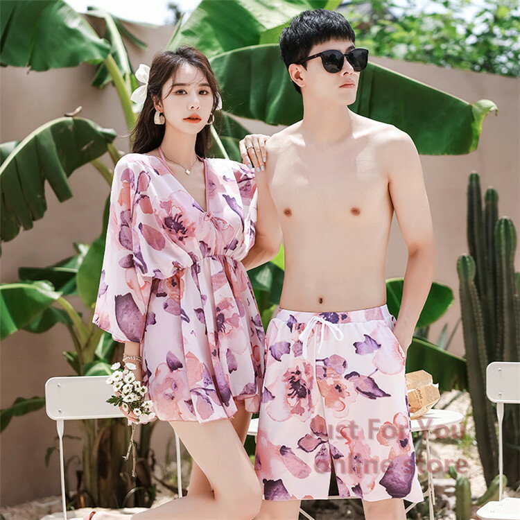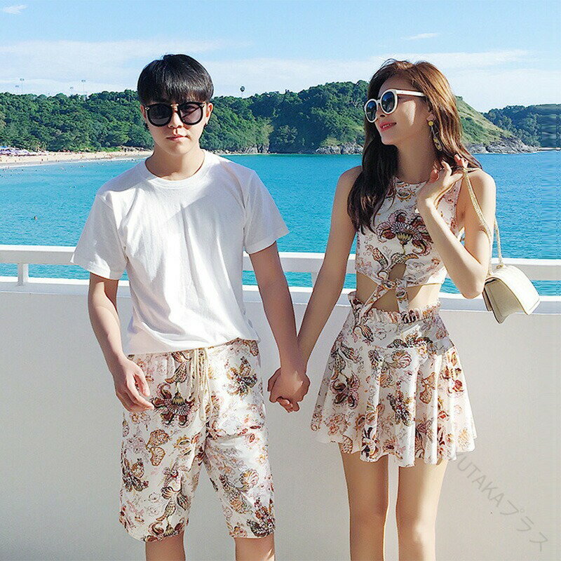 ペア水着 カップル値段 ペアルック水着 3点セット レディース メンズ セパレート 花柄 パッド付き ノーワイヤー ビーチパンツ サーフパンツ 男女兼用 温泉 ハネムーン 蜜月 海外旅行 新婚旅行 夏用 mizugi ミズギ