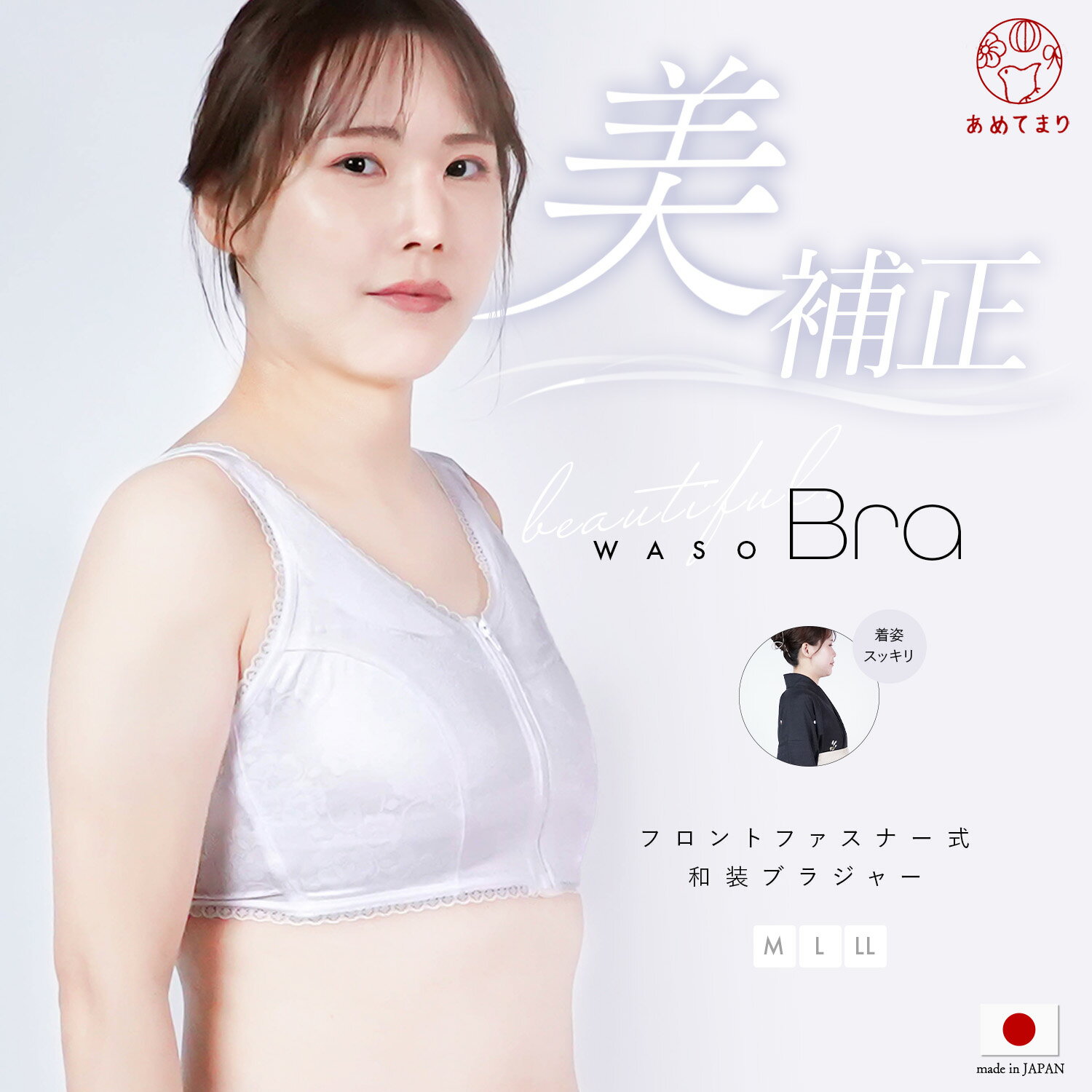 \「美補正」で美しい着姿に/和装用ブラジャー 日本製 美しく装うため着付けの基礎をつくる 和装に最適な和装用ブラジャーです。 フロントファスナー式/補正パッド付き この度、あめてまりが満を持して「和装ブラジャー」を発売しました。 老舗和装着付け小物メーカーにて国内で1点1点こだわって作られた和装専用ブラ。 高い補整力・高機能・お求めやすい価格の三拍子が揃っているため、 着物を初めて着られる方から、毎日のように着られる方まで全着物ユーザーにおすすめです。 【しっかり胸をホールドし胸元スッキリ】 着物を着たときに胸元がキレイに見えるように設計しました。 なめらかなハト胸に補正することでムダなシワも減り、衿元の崩れを軽減します。 フロントでファスナーを止めるタイプなのでとてもラクに脱着。ヘアースタイルも崩しません。 胸下裏部分もポケット付きで、必要な分だけガーゼなどをポケットに詰めさらに補正をすることも可能です。 花柄レース素材が清潔感と高級感をプラス、肩紐も太めで、肩にかかる負担を軽減しました。 【和装には一般的な洋装用ブラジャーは適していません】 和装ブラジャーは普段使用されている洋装ブラと使用目的が異なり、 胸をなだらかにする為に使います。 キモノの世界では、胸のふくらみが目立ったり胸が帯に乗ってしまうのは あまり好まれてはいません。 普段ご使用の洋装用ブラジャーで着物を着た場合、着崩れしやすく胸元がスッキリしません。 着物専用「和装ブラジャー」を着用しお着物を着ていただくことで スッキリなだらかな「ハト胸」に補正、無駄なシワも減り着姿がとても美しく見えます。 【全方向 美補正 美シルエット】 立体裁断×伸縮性の高いレース素材の生地で、締め付けすぎず、無理なくバストを整えます。 振袖や訪問着などのフォーマルから浴衣まで、どんな着物にもご使用いただけ、着崩れを防ぎます。 オールシーズンでご利用でき、着物初心者の方にもおすすめです。 【5つのこだわりポイント】 1. 取り外し可能な補正パッド2枚付き 内側のポケットに補正パッドを入れて、くぼみを埋め、補正することができます。 スッキリなめらかでキレイな「ハト胸」の完成。 2. 前開きフロントファスナー式 前開きなので、セットしたヘアースタイルを崩すことなく脱着していただくことが出来ます。 ストレスなくラクに着用できます。 ファスナー(金具)が直接お肌にふれないよう、裏地にマチがついています。 3. 高級感と清潔感 花柄レース素材 繊細で艶のある花柄レース素材。 表に響かない白。縁には繊細なレースが 清潔感と高級感を醸し出しています。 4. 各サイズ5〜10cm程の伸縮 体に程よくフィットする充分な伸縮性。 和装に適した体型に補正が可能。 5. 安心の抗菌・防臭加工生地 肌にふれる面の綿ニット天竺は抗菌・防臭加工生地を使用しております。 着心地がとても爽やか。 【バストサイズ】 ・Mサイズ:79〜87cm ・Lサイズ:86〜94cm ・LLサイズ:93〜101cm ※ トップのサイズを基準にお選びください。 ※ アンダーに空間が空くことがありますが、補正に影響はないので大丈夫です。 ※ サイズはおおよその値になります。 【カラー】ホワイト 【素材】 ・生地:ナイロン・ポリウレタン・その他 ・裏地:綿 ※ お洗濯の際は洗濯ネットをご使用ください。 【原産国】 日本 【注意事項】 ※サイズはおおよその値になります。 ※入荷時期により、若干サイズやデザイン、カラー、素材などが変更になることがございます。(パッケージデザイン含む) ※表示されている画像の色はできるだけ実際の商品に近づけるよう努力をしていますが、お使いのモニター環境によって差異が生じます。 ※直接肌に触れる商品ですので、「思っていたものと違った」や「サイズ間違い」などのお客様都合の返品交換はお受けしかねます。 ※商品に多少のシミ・汚れ・ほつれ等の生地難があることがございます。予めご了承の上ご購入ください。 ※配送時・保管時に袋が破ける可能性がございます。返品交換対象外となりますのでご了承ください。