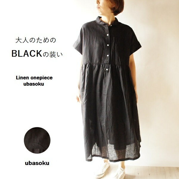 ubasoku ウバソク リネン 麻 小襟 ウエストギャザー かぶり 二枚袖 ワンピース ub27-0958 レディースファッション 服 大人の ナチュラル ゆったり 大人コーデ きれいめ シンプル カジュアル 30代 40代 50代 60代 大きい 大人 無地 ブラック 大人フェミニン 大人女子 ladies