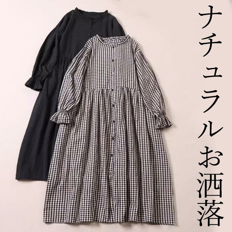 ギンガムチェック ブラックウォッチ風 40代 50代 ナチュラルなお洒落 長袖ワンピース シンプル可愛い エプロンワンピース ロング丈 マキシ丈 ポケット 北欧風 北欧ファッション ゆったり シャツワンピース タータンチェック風 プチプラ 送料無料