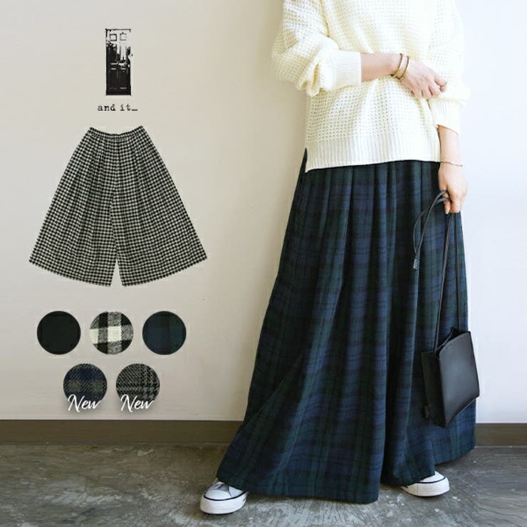 【10%OFFクーポン!11/27(木)1:59まで】and it ワイドパンツ レディース エミュラル emural ネルタックワイドパンツ【M-L】ボトムス 秋冬 ブラックウォッチ グレーブラック ブラックアイボリー ウエストゴム 楽ちん ゆったり