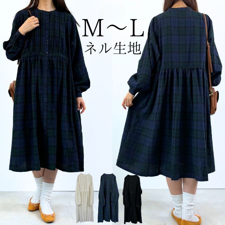 ネル タック レース ワンピース 長袖 レディース プルオーバー 綿100% ロングワンピース ブラウスワンピース 無地 ブラックウォッチ チュニックワンピース ノーカラー ゆったり 大きいサイズ ナチュラル カジュアル [M便 不可]