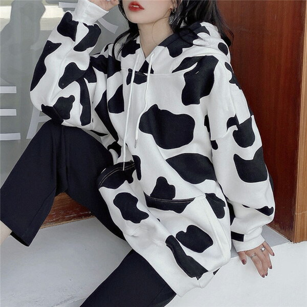 【送料無料】 パーカー COW柄 牛柄 ダルメシアン柄 スウェット オーバーサイズ 長袖 プルオーバーパーカー ダンス 衣装 ヒップホップ コスチューム 韓国ファッション 大きいサイズ 個性的 トップス