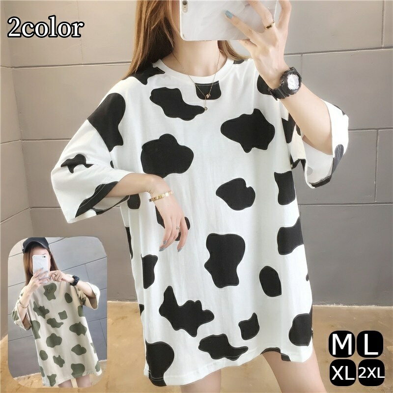 Tシャツ レディース 半袖 カジュアル ペア カップル ロゴTシャツ 大人 トップス プリント カットソー ブランド ゆったり 大きいサイズ かわいい おしゃれ ホルスタイン cow 牛柄 milk ミルク ゆるかわ ワンポイント
