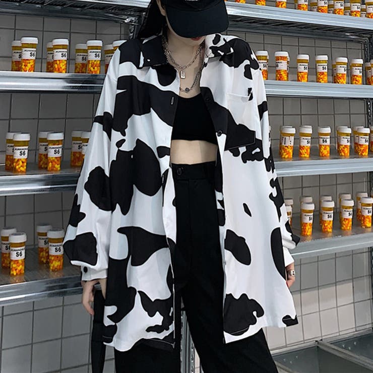 【10%OFFクーポン!11/27(木)1:59まで】Decorative 柄シャツ COW柄 オーバーサイズ 牛柄 モノトーン 長袖 ダンス 衣装 ヒップホップ コスチューム 韓国ファッション 大きいサイズ 個性的 春服 秋服 シャツ トップス
