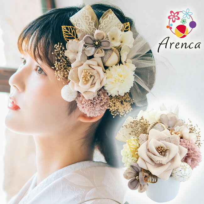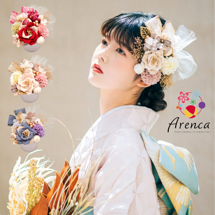 振袖用髪飾り Arenca シャルロット charlotte かんざし 選べる3カラー 成人式髪飾り ウエディング ヘアーアクセサリー 袴 振袖 浴衣 きもの ゆかた 和装小物 あなたを花束にするかんざし 【Arenca シャルロット】洋のテイストに彩度控えめのエレガントカラー。レースやチュールの西洋素材をアクセントに、日本の技法を用いて仕上げられています。お花の一部にレース生地の花弁を差し込み柔らかく優しい風合いがあります。リボンはオーガンジーの上にレースを重ね立体的にし、軽やかなチュールは二重にしてボリュームを出しふんわりとした女性らしい可愛らしさを演出します。最後に金色のかすみ草を添えてアンティーク感をプラス。飾りはすべて別々に分かれていて、留め具はシンプルなUピン仕様です。アレンジ性に優れ、ヘアスタイルに合わせて全体に散りばめたり、集め合わせたりと自在に使用できます。晴れの日の振袖はもちろん、浴衣やパーティードレス、普段使いまでお好みの組み合わせでご使用ください。使用されない時にはインテリアとして身近に置くことが出来ます。◇セット内容◇〈パーツ数16〉大花×1 (花径6.5cm)小花×1 (花径4cm)中玉×1 (玉径3cm)小玉×1 (玉径2.5cm)アネモネ×1 (花径4cm)葉×2 (縦幅4.5cm、横幅2.5cm)マム×2 (花径5cm)アジサイ×2 (花径3.5cm)チュール×1 (縦幅9cm、横幅16cm)レースリボン×1(縦幅6cm、横幅9cm)実玉3粒×1 (玉径1cm)金色かすみ草×2 (縦幅7cm、横幅6cm)※天然素材のため、サイズや色等に多少の差がございます。◇素材◇ポリエステルレーヨン、綿、ブリザーブドフラワー、発砲スチロール、樹脂、鉄◇注意◇※ご覧いただいている環境等により色みが異なって見える場合がございます。※パーツの配置が異なる場合がございます。 5