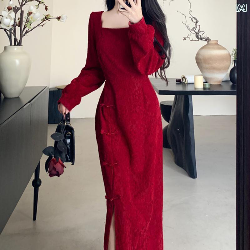 大きめサイズ レディース おしゃれ ファッション カジュアル フェミニン 上品 デート 女子会 チャイナ風 花嫁 赤 婚約 ホーム ドレス 秋冬 チャイナ ドレス 着 ドレス