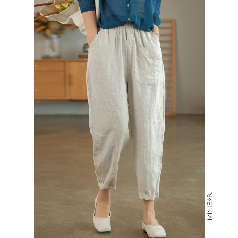 麻 リネン パンツ レディース 春夏 ハーレムパンツ テーパードパンツ ゆったり ウエストゴム カジュアル 文芸風 亜麻混紡 リネン混紡 白 黒 オレンジ マスタード 深紫 グレープフルーツ 麻色 モスグリーン(x2)