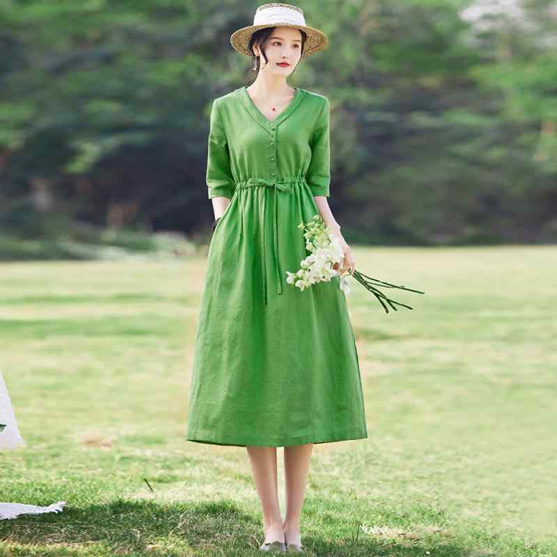 ・カテゴリ: ワンピース・スタイル: ベーシック、レトロ、ヴィンテージ・主な素材: 麻95%以上・柄: 無地・加工: パッチワーク、切り替え・形式: 単品・スカート丈: ミディ丈・スカートの形: Aライン・ネックライン: ハートネック・袖タイプ: レギュラー・袖丈: 五分袖・ウエストタイプ: ハイウエスト・デザインポイント: リボン・カラー展開: グラスグリーン・サイズ展開: S、M、L、XL