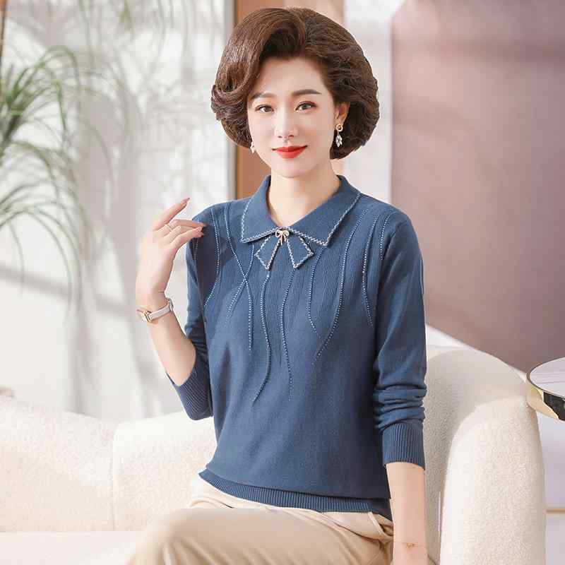 ニット ミセス レディース ゆったり ラウンドネック プルオーバー セーター 上品 エレガント きれいめ カジュアル かぎ針編み風 ラインストーン トップス アクリル ポリエステル