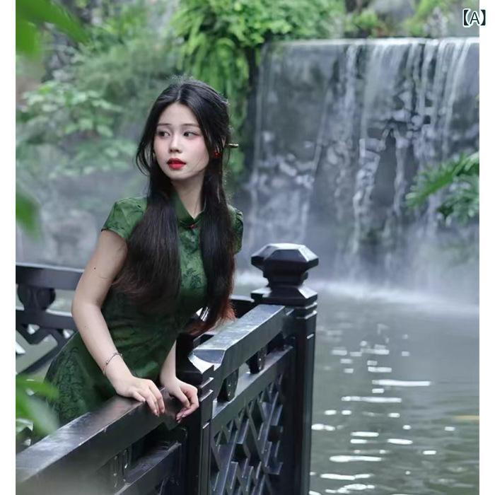 レディースシアーフラワープリーツワンピース 長袖 ガーリー きれいめ Tan Qingke チャイナ風 ジャカード チャイナ ドレス レディース 春の レトロ 半袖 ドレス
