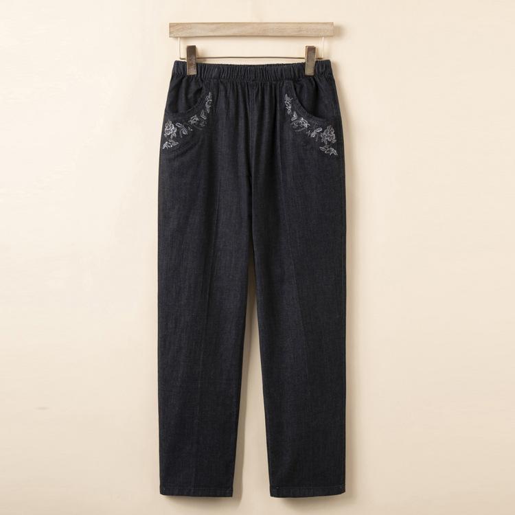 ボトムス レディース 女性用 ミセス シニア ママ向け ポリエステル ゆったり ストレート ロングパンツ 長ズボン カジュアル リラックス 普段使い 刺繍 微ストレッチ 黒 青