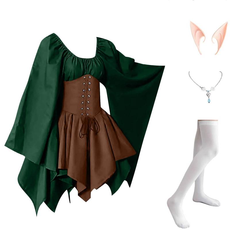 ワンピース レディース 中世 ヨーロッパ レトロ ロングワンピース 撞色 切り替え 喇叭袖 不規則 民族風 文芸復古 演奏会 パーティー ゴスロリ コスプレ ハロウィン