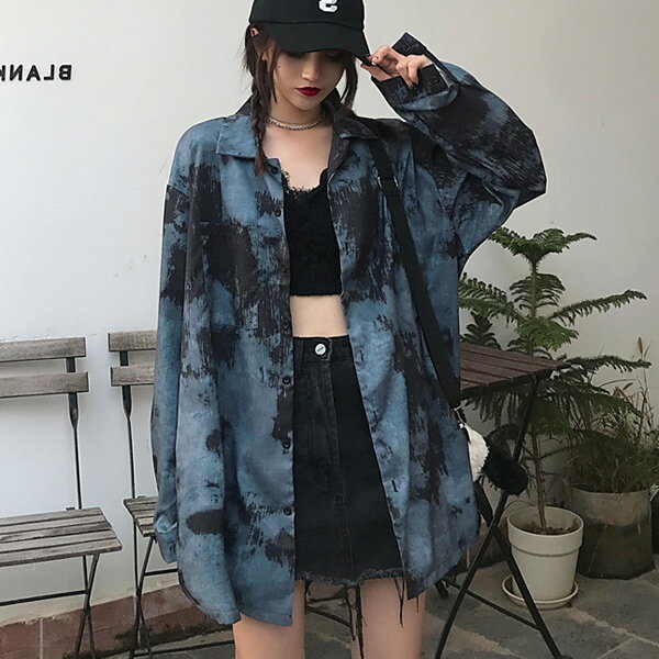 柄シャツ 長袖 モアレ ダークカラー ブルー ビッグシルエット 春服 秋服 シャツ トップス ダンス 衣装 ヒップホップ コスチューム 韓国ファッション 大きいサイズ 個性的 服