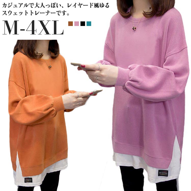 カジュアル トレーナー レイヤード風 秋 春秋 春服 春 インナー 秋冬 ロングT Tシャツ 冬 ラウンドネック 重ね着風 ブラック 長袖 2XL 秋服 秋服 レディース 大きいサイズ M L XL トップス 3XL 4XL ゆったり ピンク ダークブルー ロング丈