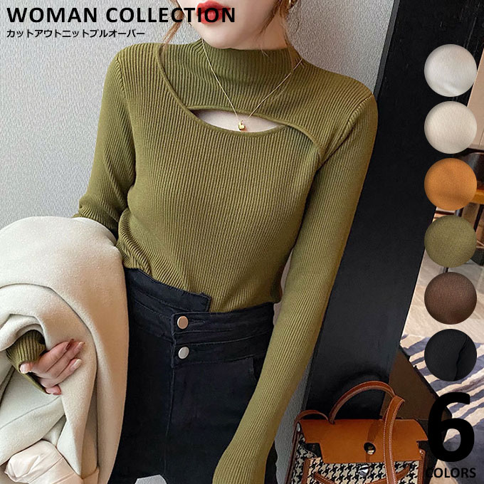 カットアウト トップス 胸開き ニット リブニット スリット ボトルネック 韓国 【メール便送料無料】 ホワイト ライトベージュ ダークオレンジ モスグリーン ブラウン ブラック フリーサイズ