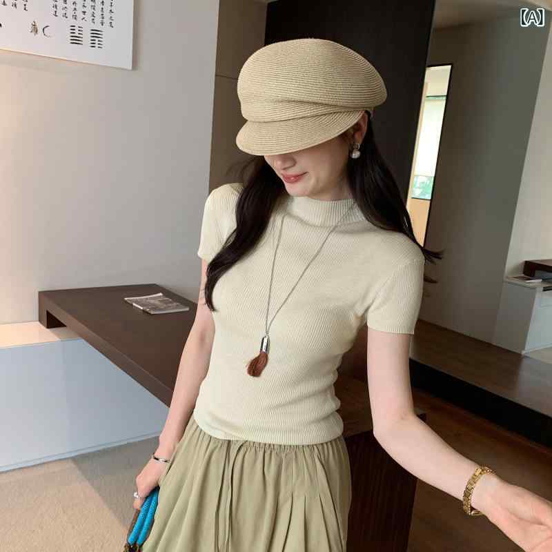 ニット セーター リブニット ハイネック 半袖 レディース トップス リヨセル 薄手 ハーフ タートルネック 右 肩 半袖 セーター レディース 夏の Tシャツ