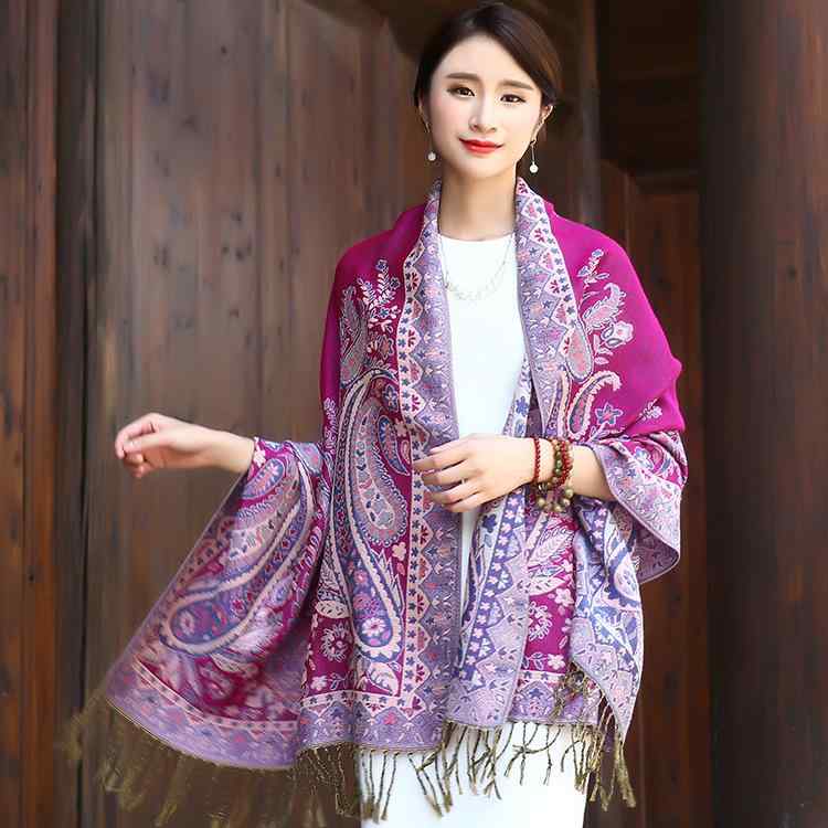 ショール レディース 秋冬 ストール 民族風 提花 あったか 大判 膝掛け 旅行 腰果柄 赤 紺色 ポリエステル アクリル