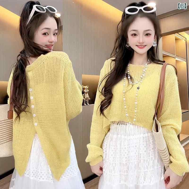 セットアップ レディース カラー バック ボタン 薄手 ニット セーター レース スカート スーツ 女性 2025 小さい サイズ ワンセット