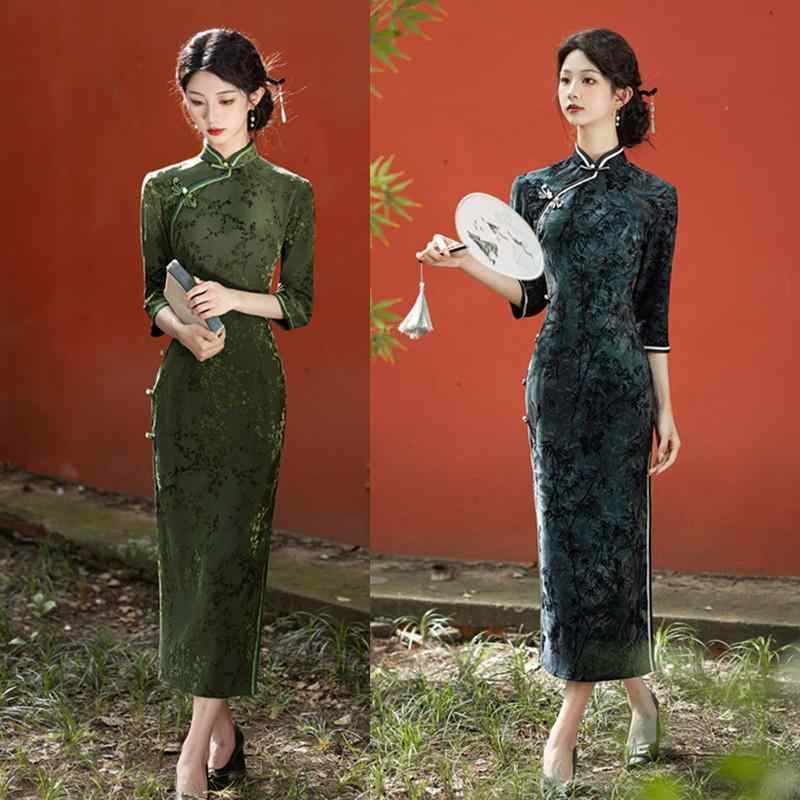 チャイナドレス レディース ミセス オールド上海風 レトロ 伝統中国スタイル 絞り染め ロング丈 七分袖 スタンドカラー 斜め襟 微ストレッチ 上品 エレガント 秋冬