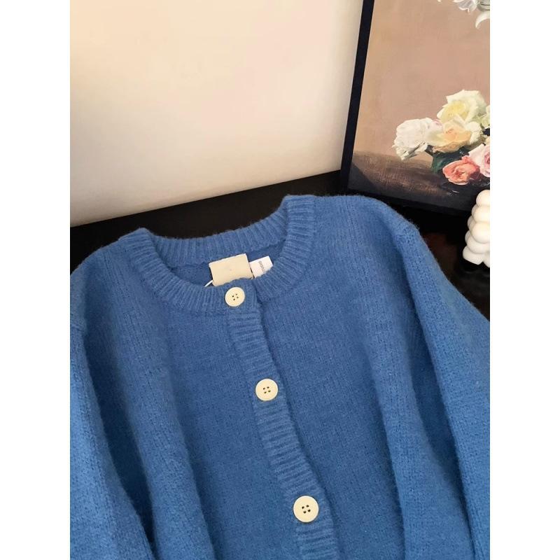カーディガン レディース ラクーン ニット ブルー 秋冬 トップス ゆったり 柔らかい 長袖 ショート丈 ラウンドネック 通勤