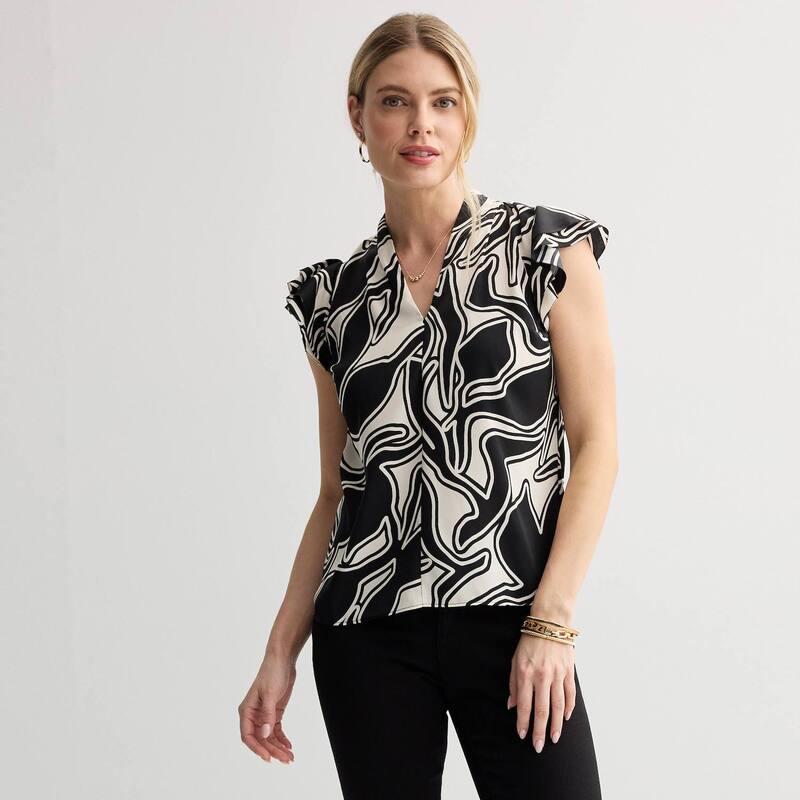 【送料無料】 ナインウェスト レディース シャツ トップス Petite Nine West Flutter Sleeve Satin Blouse Black Outline Abstract