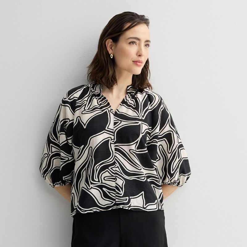 【送料無料】 ナインウェスト レディース シャツ トップス Petite Nine West Textured Elbow Sleeve Popover Top Black Outline Abstract