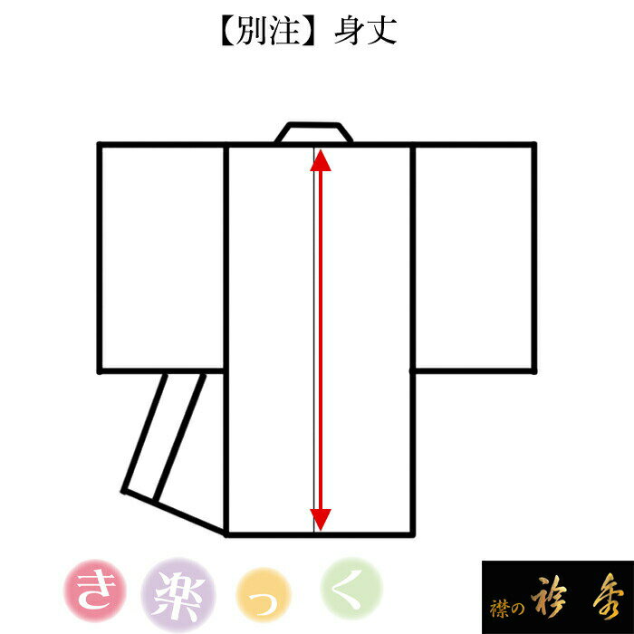 ショップトップはこちら き楽っくはこちら 替え衿はこちら 替え袖はこちら【寸法】 身丈の別注が可能です。 ※身丈はお客様の身長-30cmをお勧めしています。(ひんやりき楽っくPremiumは-33cm) 歩きやすさから、敢えて短めにされるケースもございますので参考にしてくださいませ。 【納期】 ご注文決済後 約2ヶ月※店舗休業日(土日祝)除く。 【ご確認ください】 こちらは身丈の「別注」に対する料金です。 別途本体の料金が掛かります。 (本体料金+こちらの別注料金となります) 別注には以下の内容がございます。 別注内容 備考 価格 身丈 身丈はお客様の身長-30cmをお勧めしています。(ひんやりき楽っくPremiumは-33cm) 歩きやすさから、敢えて短めにされるケースもございますので参考にしてくださいませ。 ¥4400 マジックテープ位置・長さ 裄はある程度の調節が可能です。(4cmのマジックテープ分=1〜3cm程の調整が可能です) 「fit」サイズのマジックテープは6cmの仕様で調整範囲が広くなっています。(6cmのマジックテープ=1〜5cmの調整が可能です) ¥2200 袖丈1尺6寸まで 1尺6寸までの長さで別注出来ます。 ¥2200 袖丈1尺6寸1分〜1尺7寸9分 1尺6寸1分〜1尺7寸9分の間で別注出来ます。 ¥4400 袖丈1尺8寸〜(半無双) 主に振袖用の袖になります。 ¥6600 袖丈1尺8寸〜(無双) 主に振袖用の袖になります。半無双と無双はお好みでお選びください。 ¥11000 袖の丸み 振袖の袖の丸みに合わせた別注になります。 ¥2200 袖巾 肩巾+袖巾=裄になります。き楽っくはマジック仕様の替え袖ですのである程度の調節が可能です。 ¥2200 肩巾/前巾/後巾(1箇所でもALLでも) 肩巾+袖巾=裄になります。き楽っくはマジック仕様の替え袖ですのである程度の調節が可能です。 既存のS/M/Lは広めの身巾。「fit」サイズは通常の身巾になっています。 ¥8800 フルオーダー お客様のサイズに合わせフルオーダーにてお作り致します。 ¥17600 寸法 身丈の別注が可能です。 備考 身丈はお客様の身長-30cmをお勧めしています。(ひんやりき楽っくPremiumは-33cm) 歩きやすさから、敢えて短めにされるケースもございますので参考にしてくださいませ。 納期ご注文決済後 約2ヶ月※店舗休業日(土日祝)除く。 ご確認ください こちらは「別注」に対する料金です。別途本体の料金が掛かります。(本体料金+こちらの別注料金となります) 製造元株式会社 衿秀日本国内の自社工場にてお作り致します。