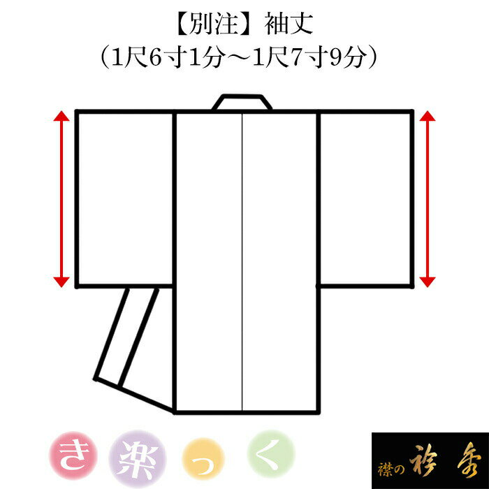 ショップトップはこちら き楽っくはこちら 替え衿はこちら 替え袖はこちら【寸法】 袖のマジックテープの位置・長さの別注が可能です。 ※裄はある程度の調節が可能です。(4cmのマジックテープ分=1〜3cm程の調整が可能です) 「fit」サイズのマジックテープは6cmの仕様で調整範囲が広くなっています。(6cmのマジックテープ=1〜5cmの調整が可能です) 【納期】 ご注文決済確認後 約2ヶ月※店舗休業日(土日祝)除く。 【ご確認ください】 こちらはき楽っくのマジックテープ別注に対する料金です。 別途本体の料金が掛かります。 (本体料金+こちらの別注料金となります) 別注には以下の内容がございます。 別注内容 備考 価格 身丈 身丈はお客様の身長-30cmをお勧めしています。(ひんやりき楽っくPremiumは-33cm) 歩きやすさから、敢えて短めにされるケースもございますので参考にしてくださいませ。 ¥4400 マジックテープ位置・長さ 裄はある程度の調節が可能です。(4cmのマジックテープ分=1〜3cm程の調整が可能です) 「fit」サイズのマジックテープは6cmの仕様で調整範囲が広くなっています。(6cmのマジックテープ=1〜5cmの調整が可能です) ¥2200 袖丈1尺6寸まで 1尺6寸までの長さで別注出来ます。 ¥2200 袖丈1尺6寸1分〜1尺7寸9分 1尺6寸1分〜1尺7寸9分の間で別注出来ます。 ¥4400 袖丈1尺8寸〜(半無双) 主に振袖用の袖になります。 ¥6600 袖丈1尺8寸〜(無双) 主に振袖用の袖になります。半無双と無双はお好みでお選びください。 ¥11000 袖の丸み 振袖の袖の丸みに合わせた別注になります。 ¥2200 袖巾 肩巾+袖巾=裄になります。き楽っくはマジック仕様の替え袖ですのである程度の調節が可能です。 ¥2200 肩巾/前巾/後巾(1箇所でもALLでも) 肩巾+袖巾=裄になります。き楽っくはマジック仕様の替え袖ですのである程度の調節が可能です。 既存のS/M/Lは広めの身巾。「fit」サイズは通常の身巾になっています。 ¥8800 フルオーダー お客様のサイズに合わせフルオーダーにてお作り致します。 ¥17600 寸法 袖のマジックテープの位置・長さの別注が可能です。 備考 裄はある程度の調節が可能です。(4cmのマジックテープ分=1〜3cm程の調整が可能です) 「fit」サイズのマジックテープは6cmの仕様で調整範囲が広くなっています。(6cmのマジックテープ=1〜5cmの調整が可能です) 納期ご注文決済確認後 約2ヶ月※店舗休業日(土日祝)除く。 ご確認ください こちらは「別注」に対する料金です。別途本体の料金が掛かります。(本体料金+こちらの別注料金となります) 製造元株式会社 衿秀日本国内の自社工場にてお作り致します。