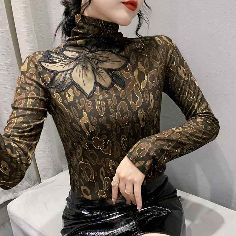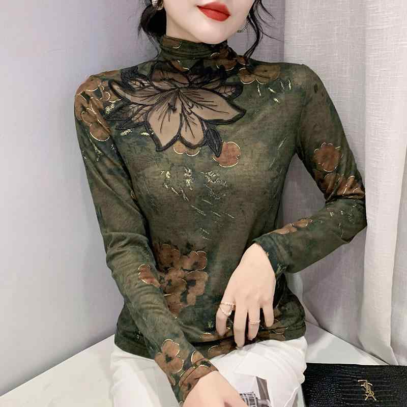 シアー トップス レディース きれいめ 柄 長袖 シャツ カットソー シースルー 大きいサイズ インナー メッシュ 透け感 ハイネック オフィス 普段使い 秋冬 セクシー エレガント ヨーロピアン ヒョウ 花 刺繍 レトロ プリント 緑 茶色 カーキ