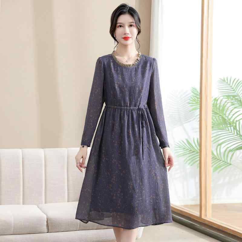 ワンピース レディース ママ ミセス 大きいサイズ ゆったり 体型カバー ヨーロピアン 宮廷風 レトロ 上品 シフォン ドット柄 ロング丈 グレイッシュブルー 春夏