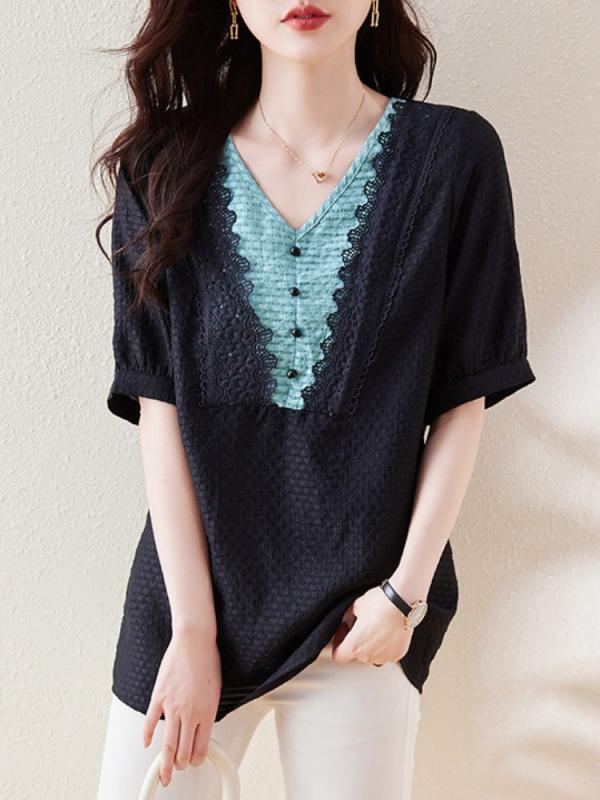 ファッション 服 オシャレ カワイイ シンプル 大カワイイ サイズ 婦服 レース Vネック シャツ 夏 ヨーロピアン ゆったり スリムトップス