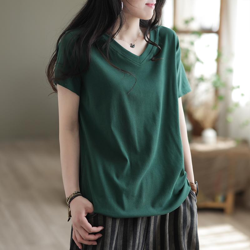 秋冬 コーデ レディース ファッション オシャレ 服 カワイイ シンプル 大人カワイイ 大きいサイズ ヨーロピアン 半袖 T シャツ 無地 Vネック シック ラベル トップス